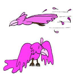 Ikki birds are curious magic creatures. Most specimens have bright pink plumage, a single feather sticking out of the top of their heads, and long wings that extend far beyond the bone structure that should normally be associated with wings like those. As such, on the ground, they look like clumsy birds with floppy wings, but in the air, they move with a beautiful, some would say unnatural, grace. Though most ikki birds seem to show a level of empathy uncommon to most birds, most thauornithologists use the fact that they can fly with those wings in the first place as justification for classifying them as magic creatures.